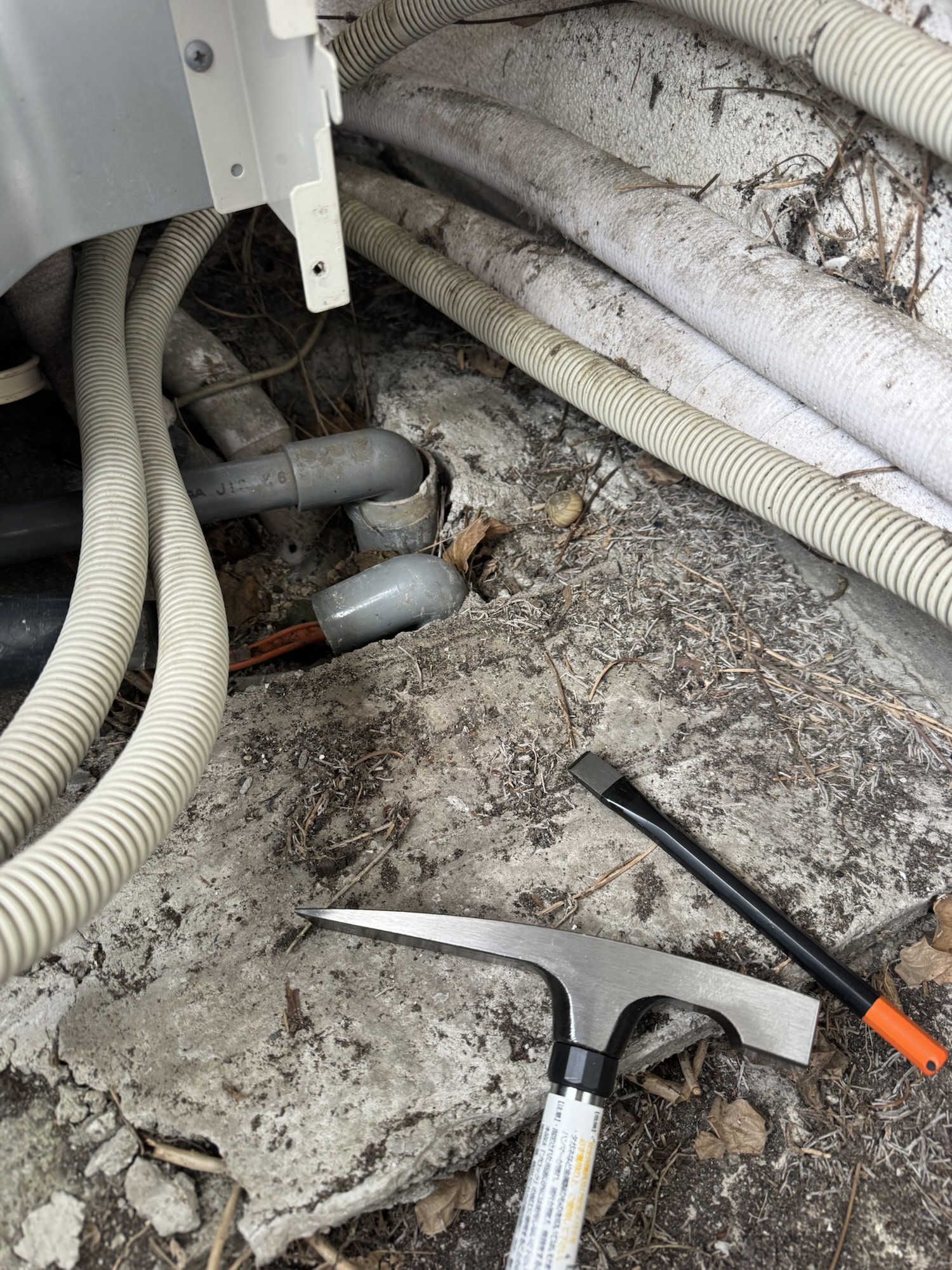 エルボーの部分しか露出していないので、そのままではキャップがつけられません。ChatGPT の指令は「コンクリートを破壊せよ!」でした。そこで、以前水晶探しに使ったロックピックハンマーとタガネが大活躍。さほど苦も無く破壊することができました。