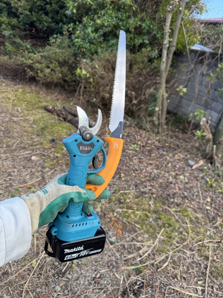 充電式チェーンソーもありますが、使う道具はほぼこの2つ。電動剪定ばさみとよく切れるノコギリ。チェーンソーよりずっと安全に作業ができます。