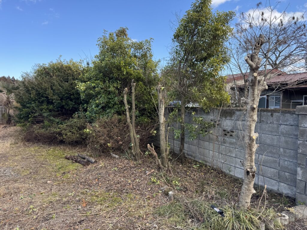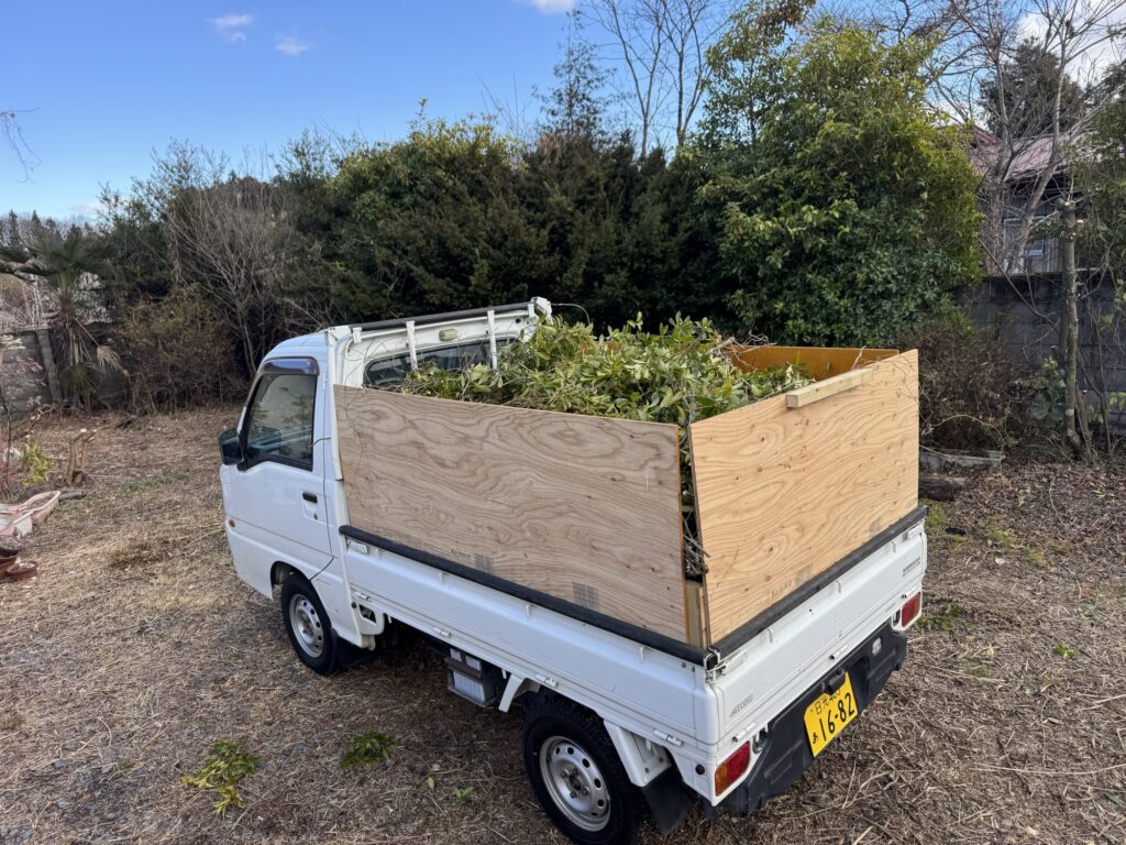 ジャングル化していた庭もだいぶすっきりしてきました。社屋とこちらの家屋の間には植木や塀がありますが、全部取っ払って広く使えるようにする予定です。まずは植木を伐採! 社用車2号が大活躍です。