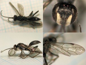 (写真の種はIrenangelus puctipleuris Wahis, 2007に間違いありません.この種は私どもの論文 Shimizu, A. & Wahis, R. (2007) Journal of Hymenoptera Research, 16: 311-325で,新種として記載したものです.別の方からも,ヒメクモバチ(ヒメベッコウ)の巣から羽化したとの情報をいただいています.本種はインド,マレー,フィリッピンなどから日本(本州の福井県まで)分布しています.東南アジア産の標本を多数調べましたが,日本産のものと形態学的に区別することができず,同種としました.南方系の種と考えてよいと思います.Irenangelusヤドリクモバチ属はCeropalesヌスミクモバチ属に近縁です.