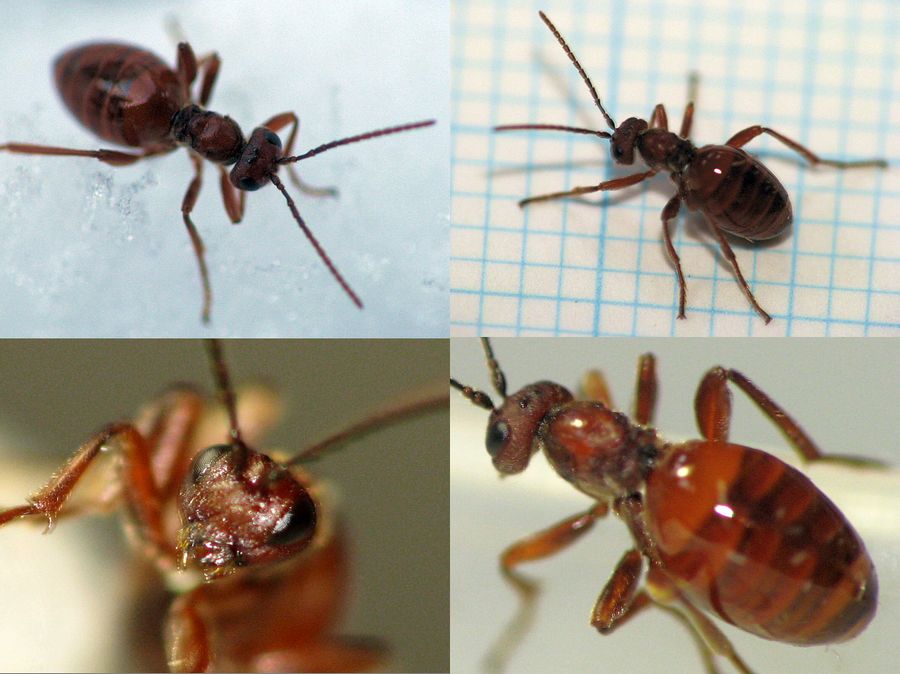 種不明その1。メス。雪に覆われた林道(標高約470m地点)にて、今まで見たことも無い変な虫が雪面を歩いていました。しばらくすると寒さで動かなくなりました(気温0℃、晴れ)。触角は14~15節ありました。体長5mm(写真上)。林道を先に進むと(標高約460m地点)もう一匹似たような虫を見つけました。同じく触角は14~15節。体長4.5mm(写真下)。(写真のハチは、タマバチ科の一種のメスと思われます。海野一男のデジタル昆虫記の他、ここでおなじみのハンマー様のホームページにも掲載されていました(すいません、勝手にリンクさせて頂きました)。by 管理人) 2008年12月下旬 山形県/しぐま様